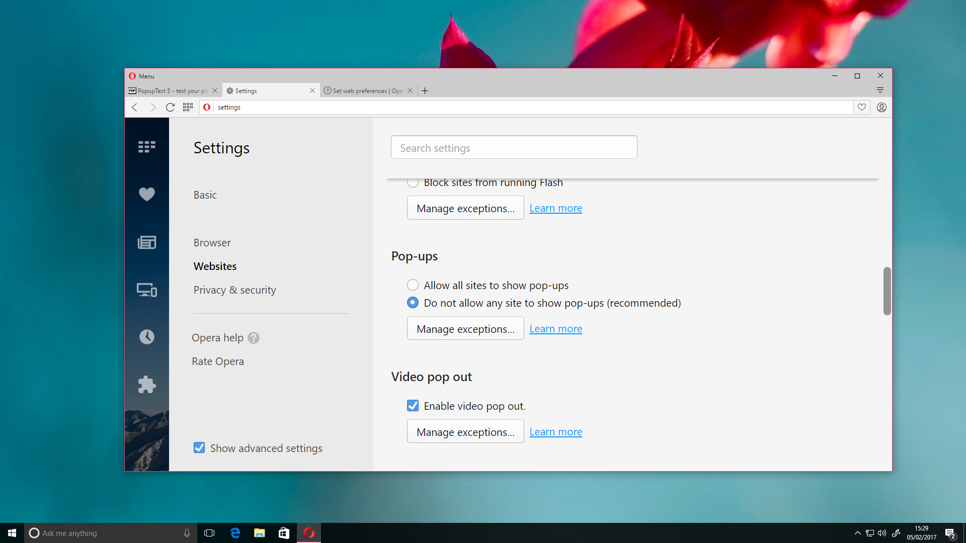 By default, Opera’s blocker does its best to distinguish between ads and legit popups, and does a sterling job at that. Using the Settings / Websites panel, you can set it to block everything (with a quick whitelist option for sites you trust), or block nothing at all, and also restrict other content like popout videos or Flash. For additional protection, Opera is extendable – there are, naturally, popup blockers in its extension library. Try Popup Blocker (strict) if Opera doesn’t match your expectations by default.